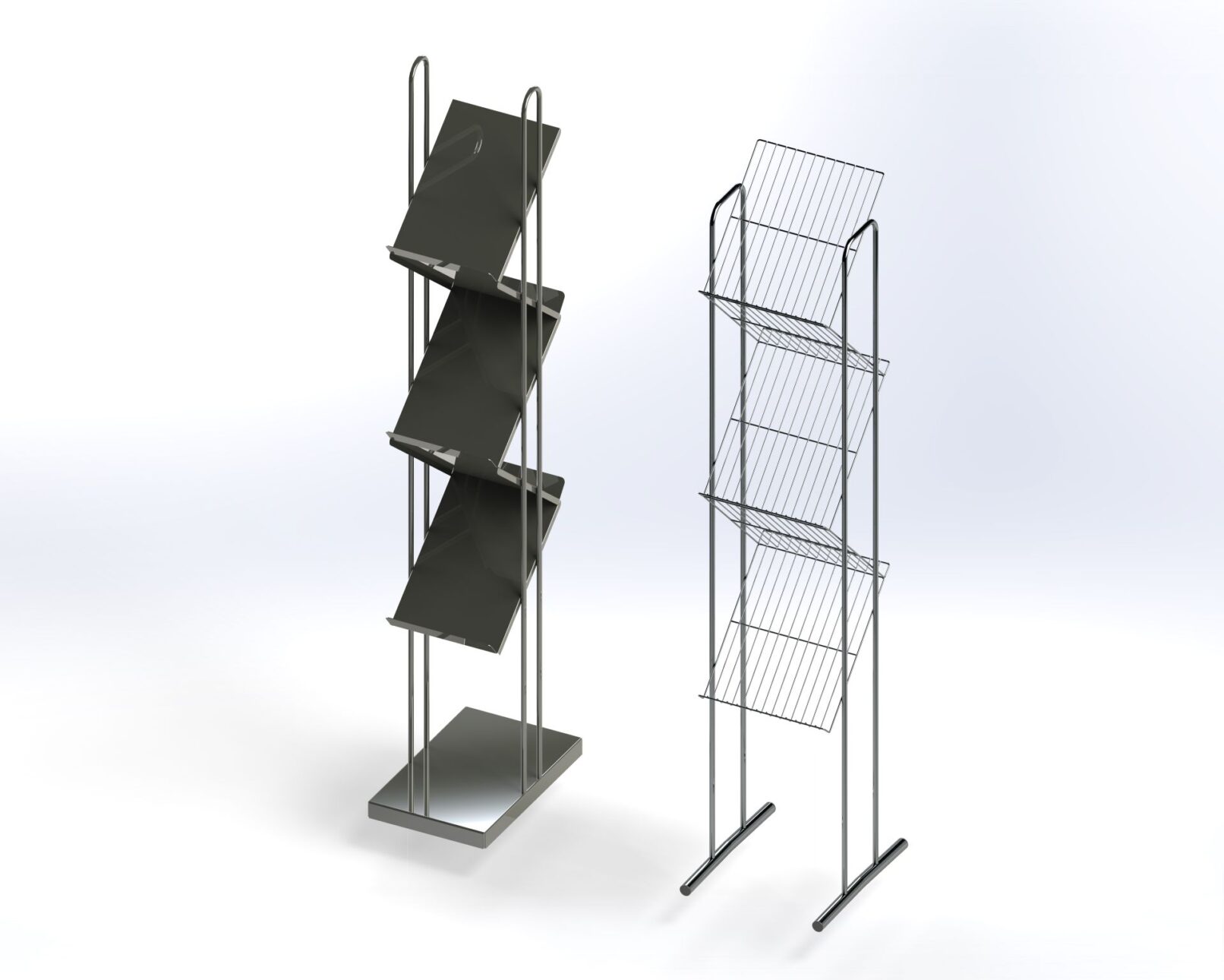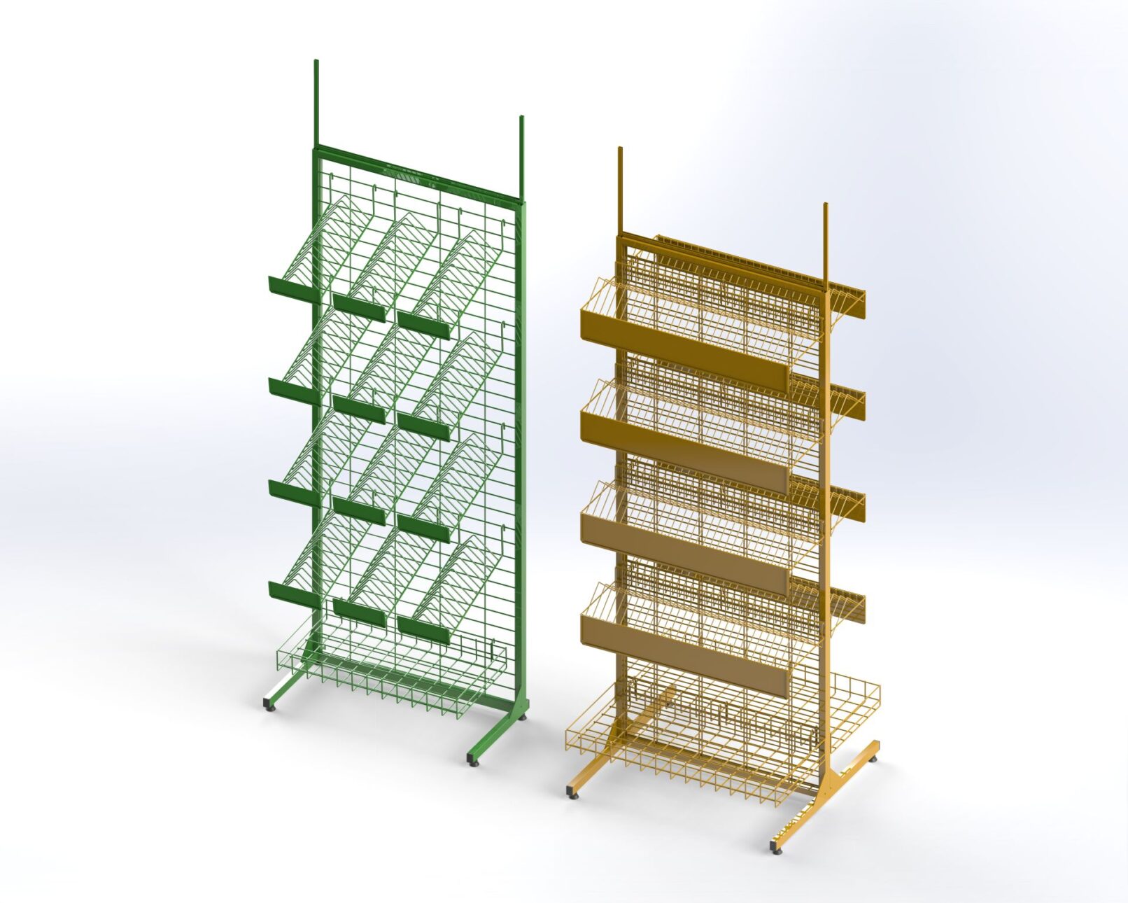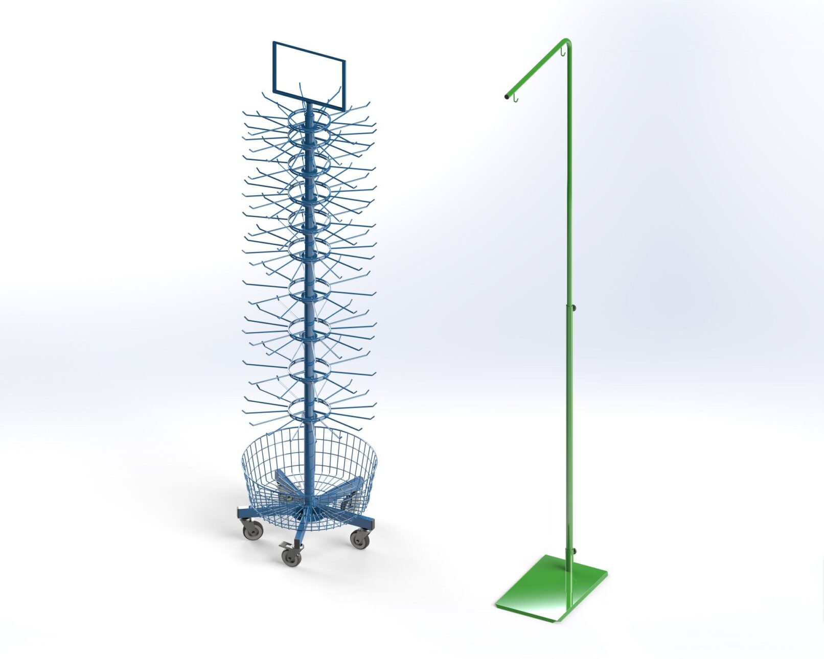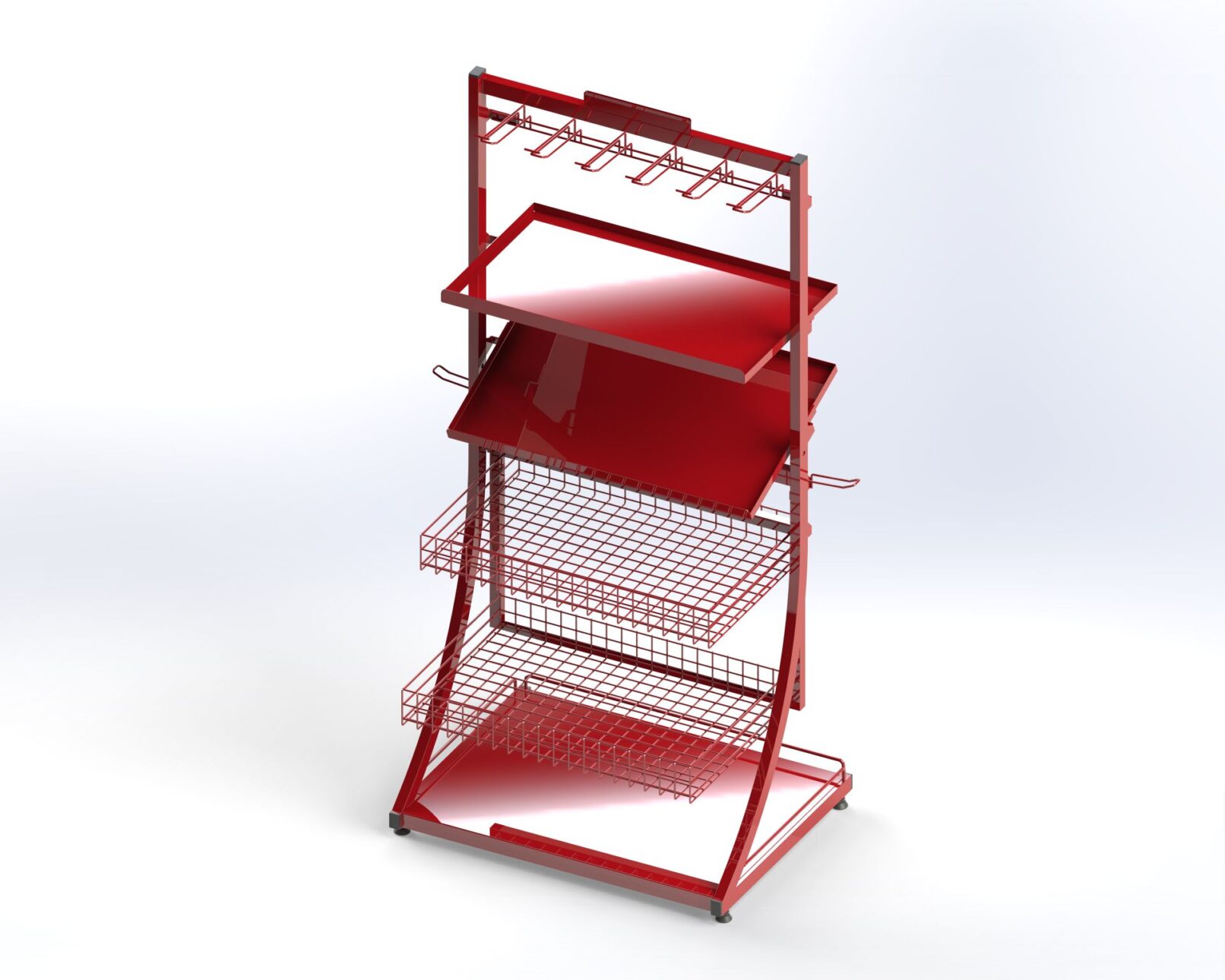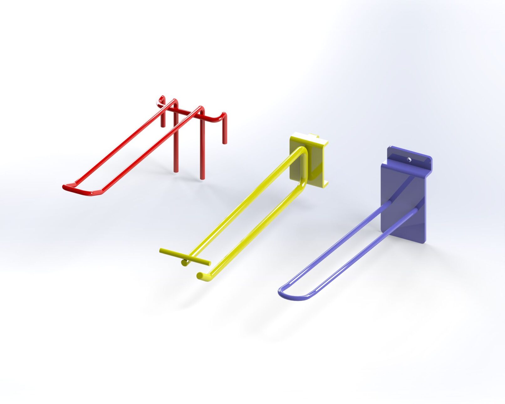 Various wire, tube, and sheet metal products for handling goods. Shelf dividers, fences, wall hooks, shop shelves.